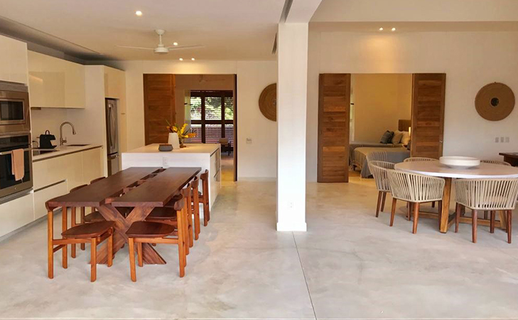With 4 1⁄2 baths, 3 King Size Beds and two full Size Beds, Integral kitchen with electric stove, toaster oven, microwave and refrigerator, Air conditioning, small living room with coffee table and television.